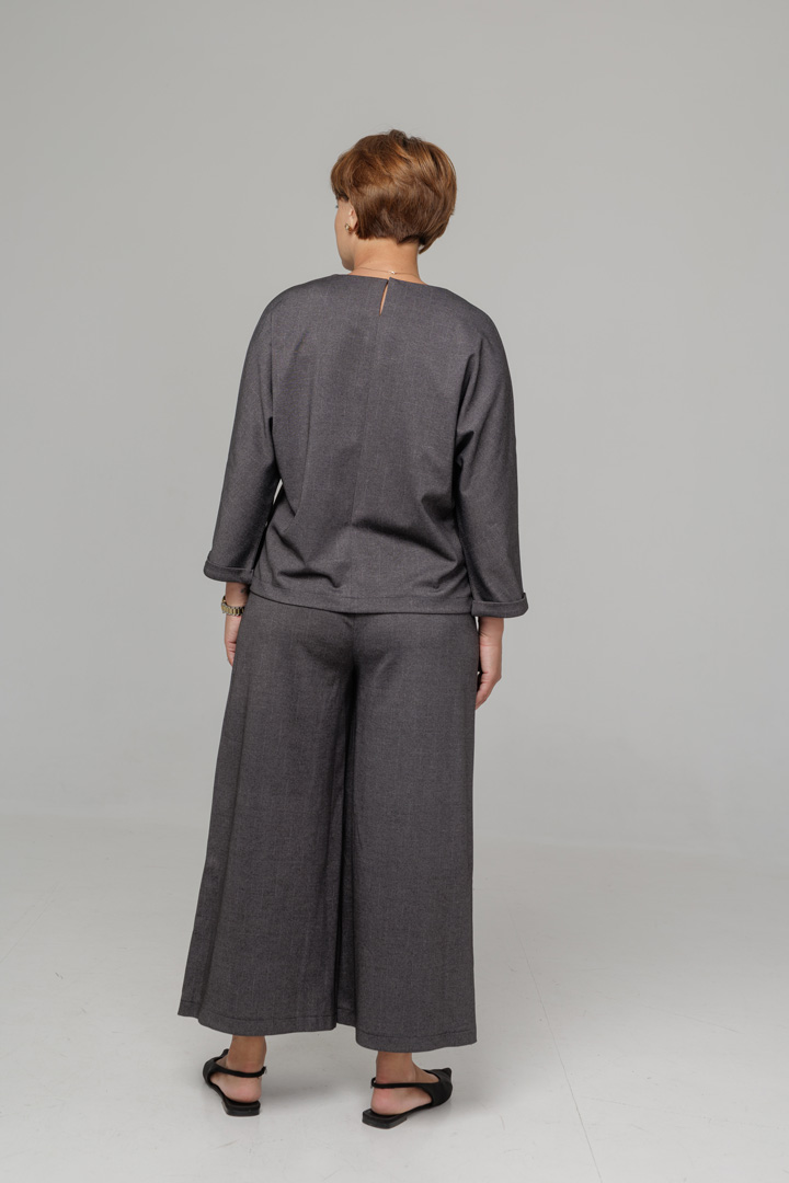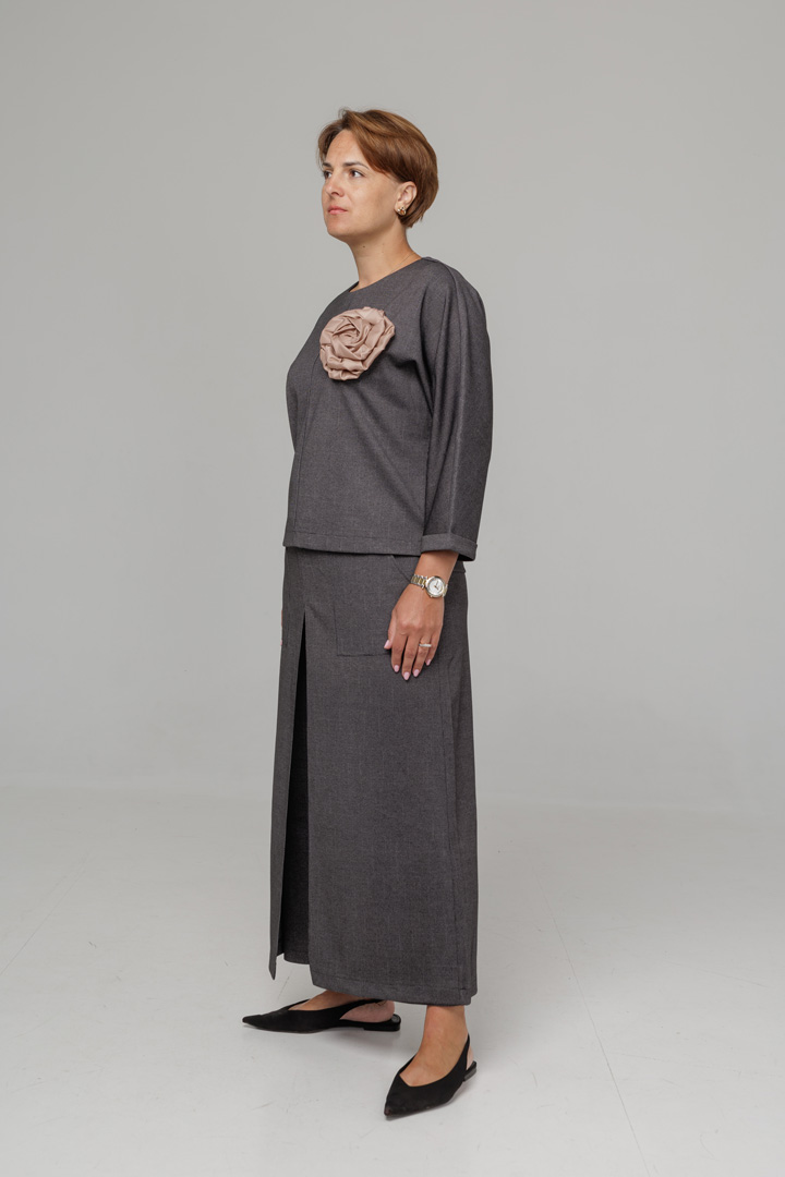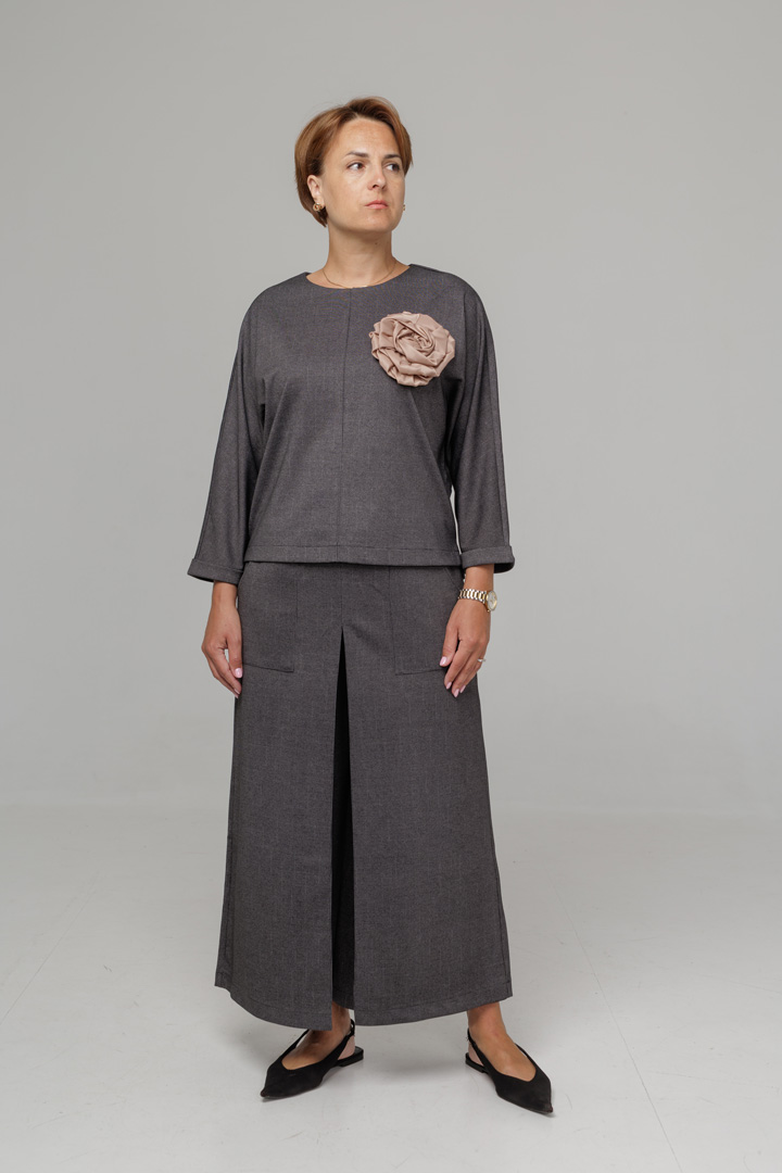 Розкішний костюм із трикотажу джерсі, який створений для компліментів. Трендові кюлоти-спідниця на еластичному поясі, мають функціональні кишені. Бомбер - спереду з защипом, який витоншує фігуру. Прикрашений авторською квіткою, що знімається.