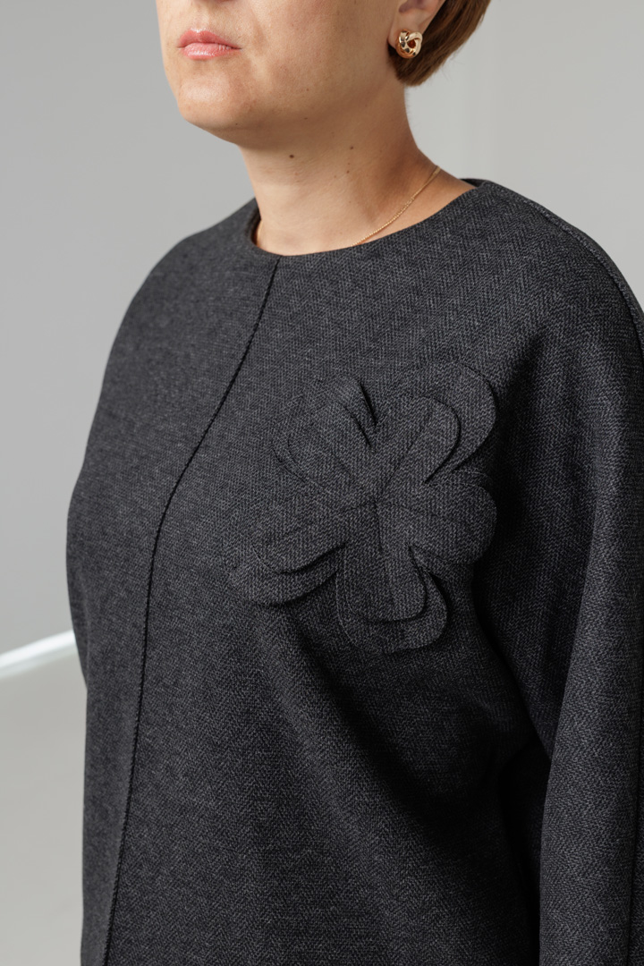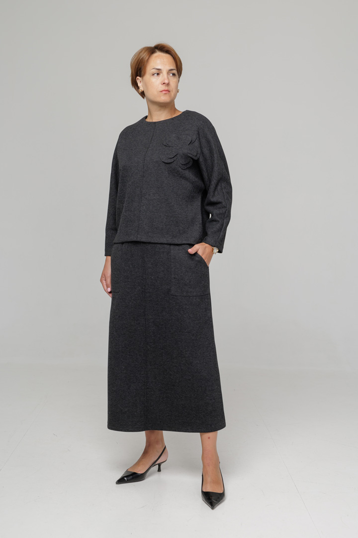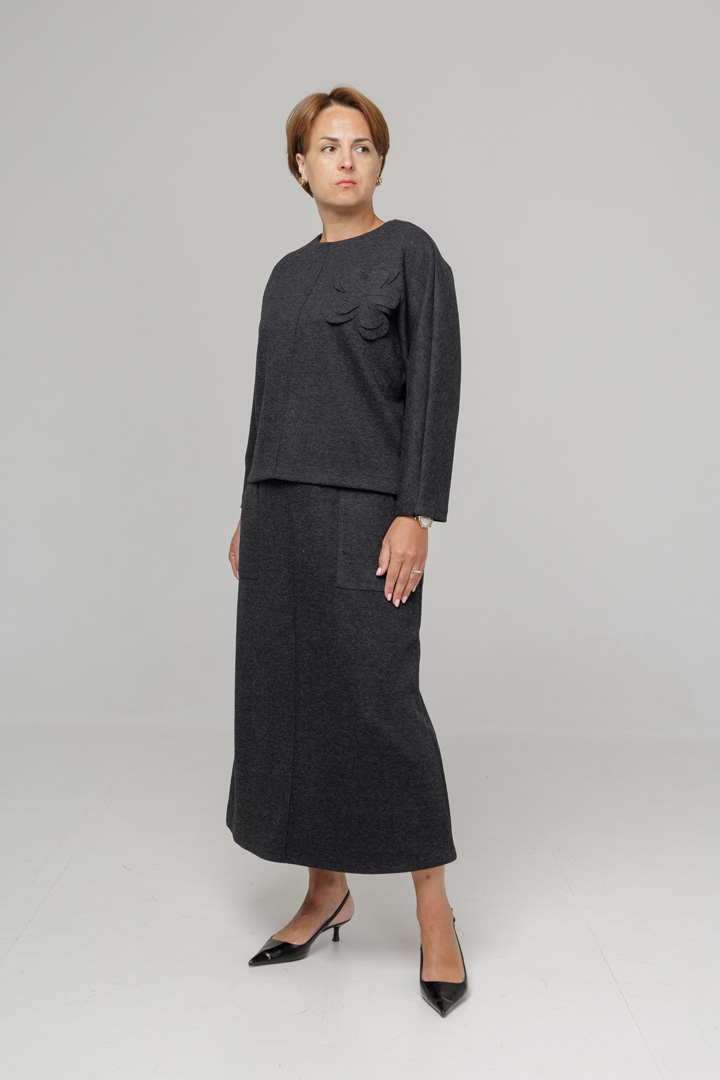 Трикотажний костюм створює вишуканий та стриманий образ. Верх - вільний бомбер з довгими рукавами, прикрашений фактурною квіткою, що додає образу жіночності. Спідниця міді з накладними кишенями підкреслює лаконічність і практичність моделі. Такий комплект виглядає стильно й універсально.