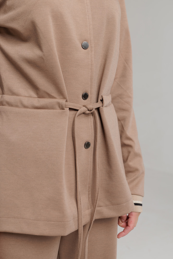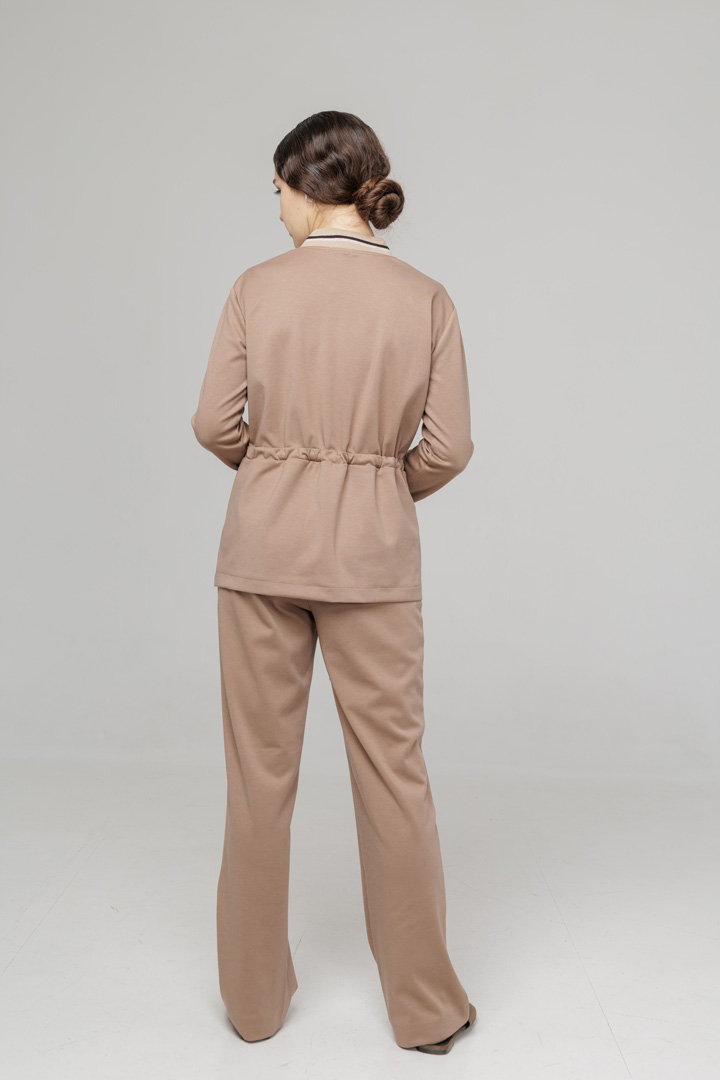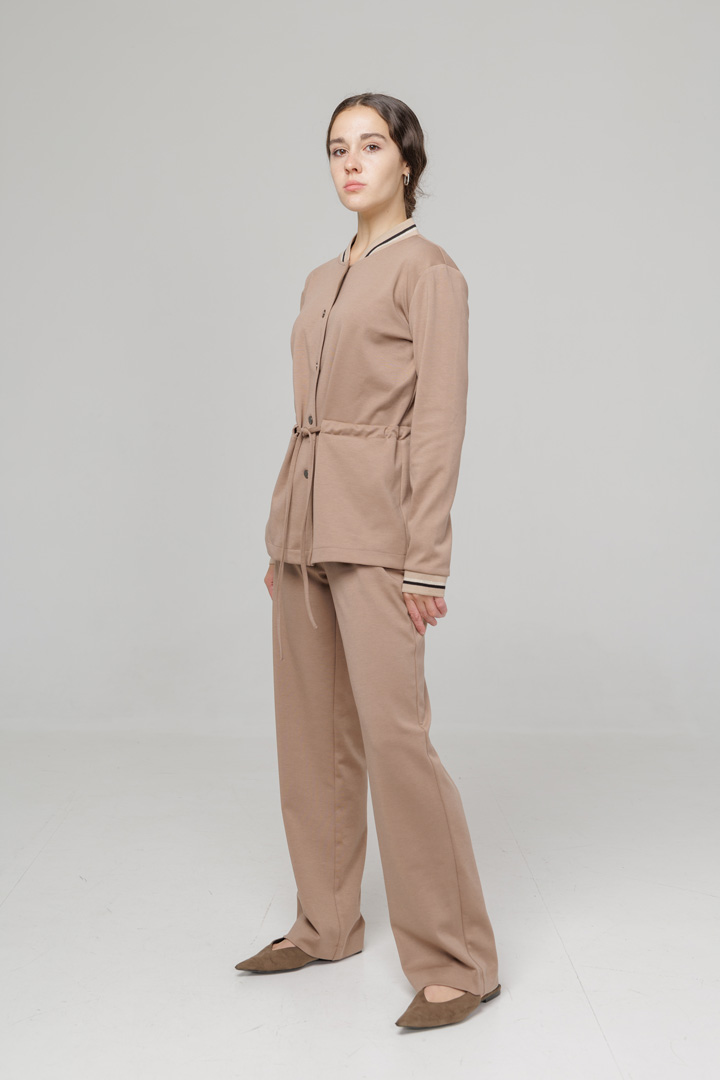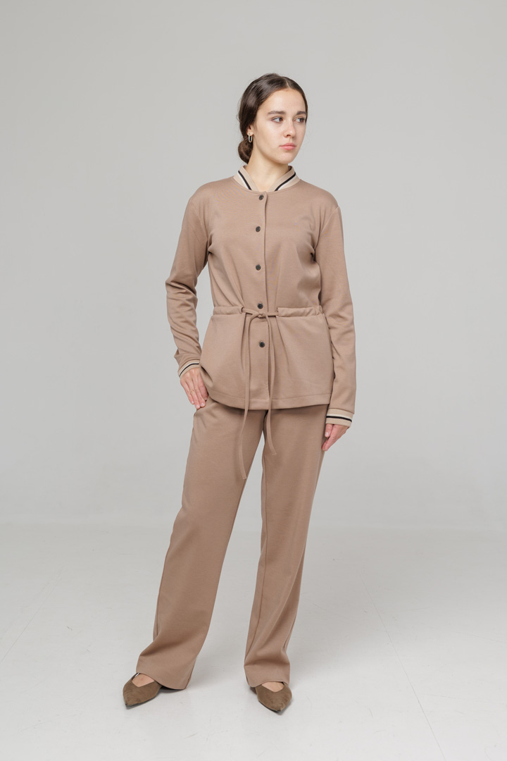 Стильний костюм із трикотажу - ідеальне поєднання комфорту та елегантності. Прямі штани на резинці та верх із кнопками та поясом роблять образ лаконічним і сучасним.