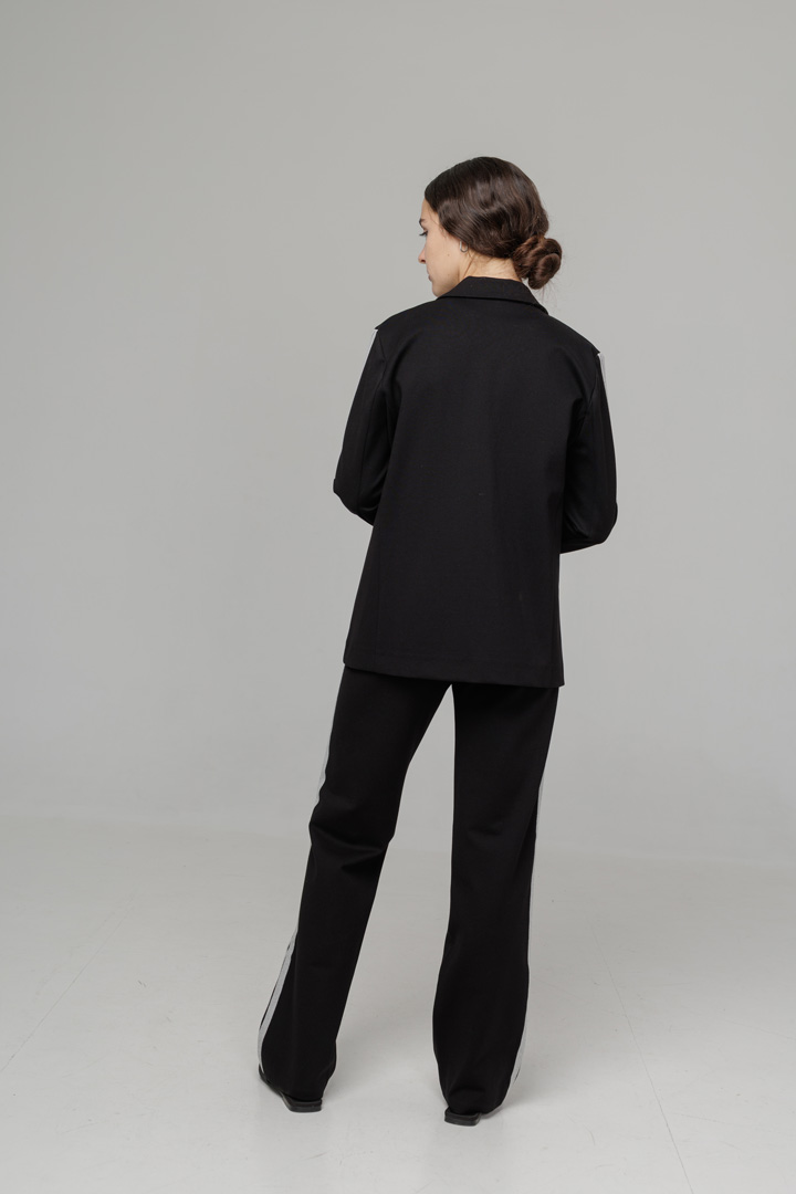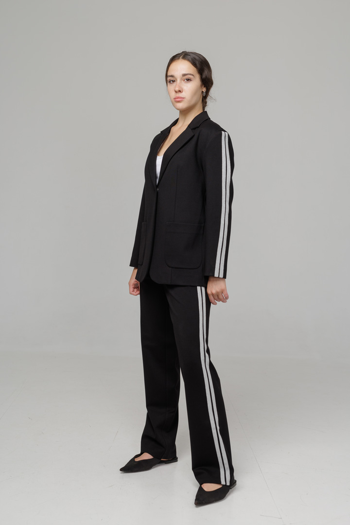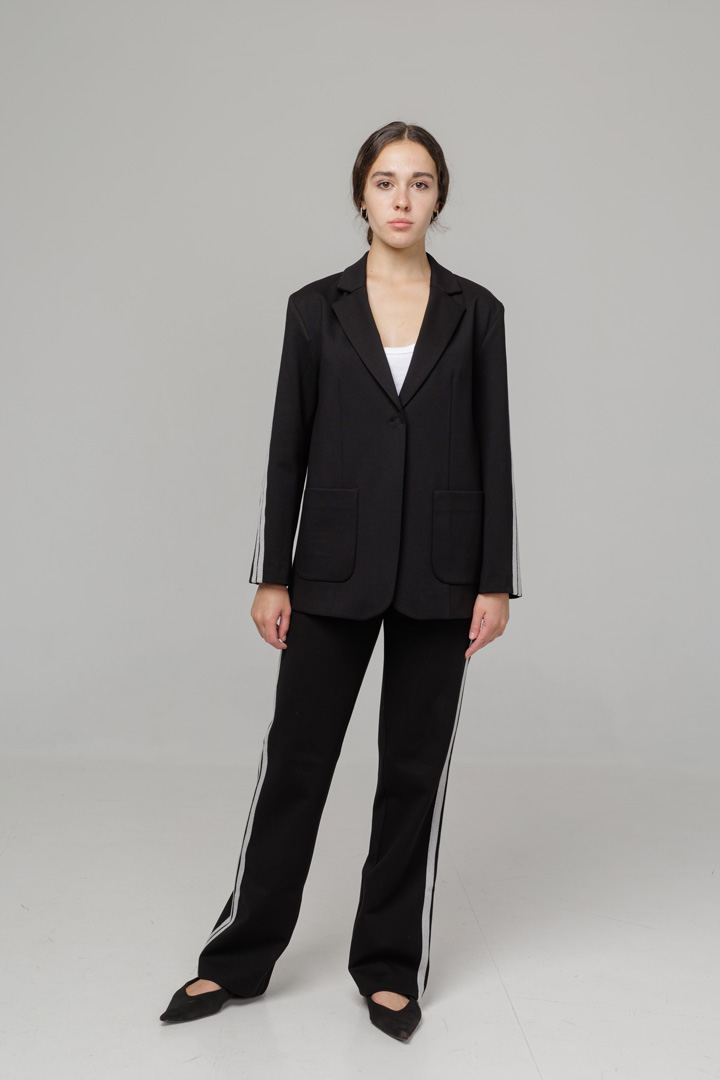 Костюм із трикотажу виглядає елегантно й водночас комфортно. Штани-палаццо із лампасами візуально видовжують ноги та створюють стильний силует. Жакет із лампасами по рукавах додає образу спортивного шарму та робить його більш сучасним. Ідеальний варіант для тих, хто любить поєднувати комфорт і трендовий вигляд.