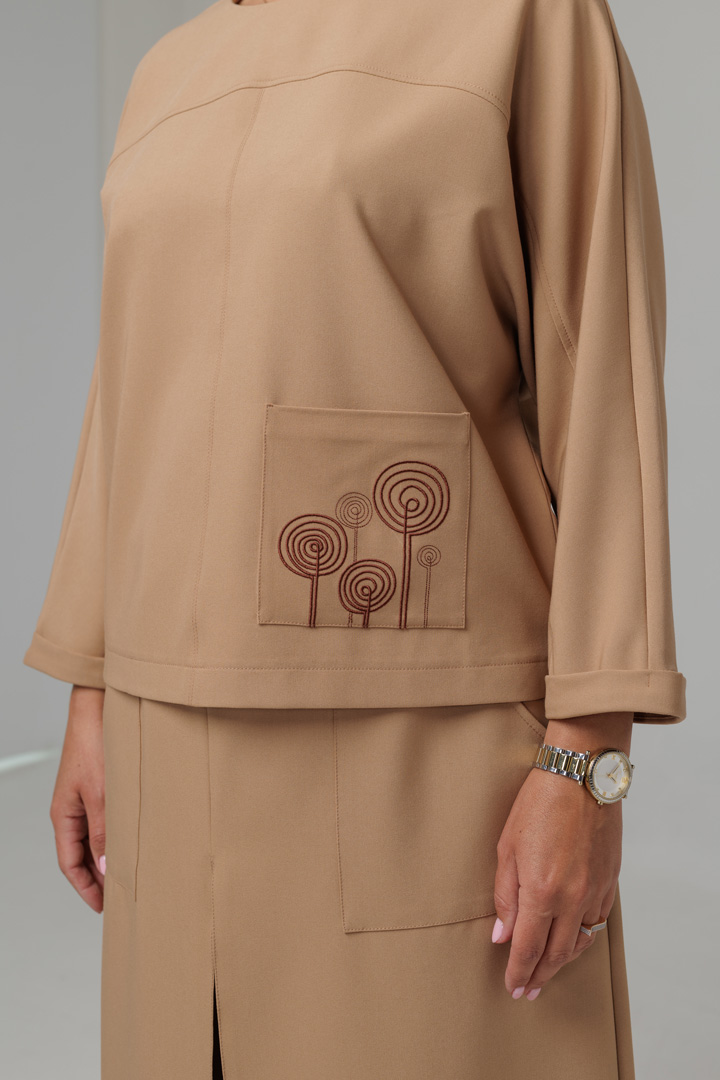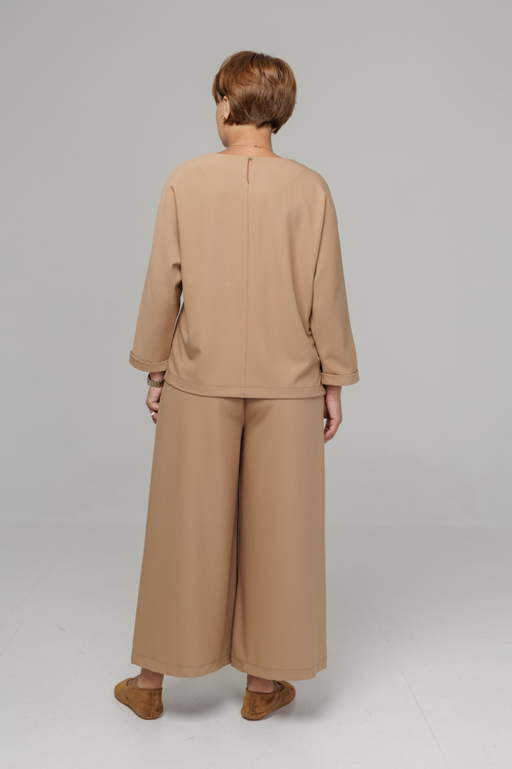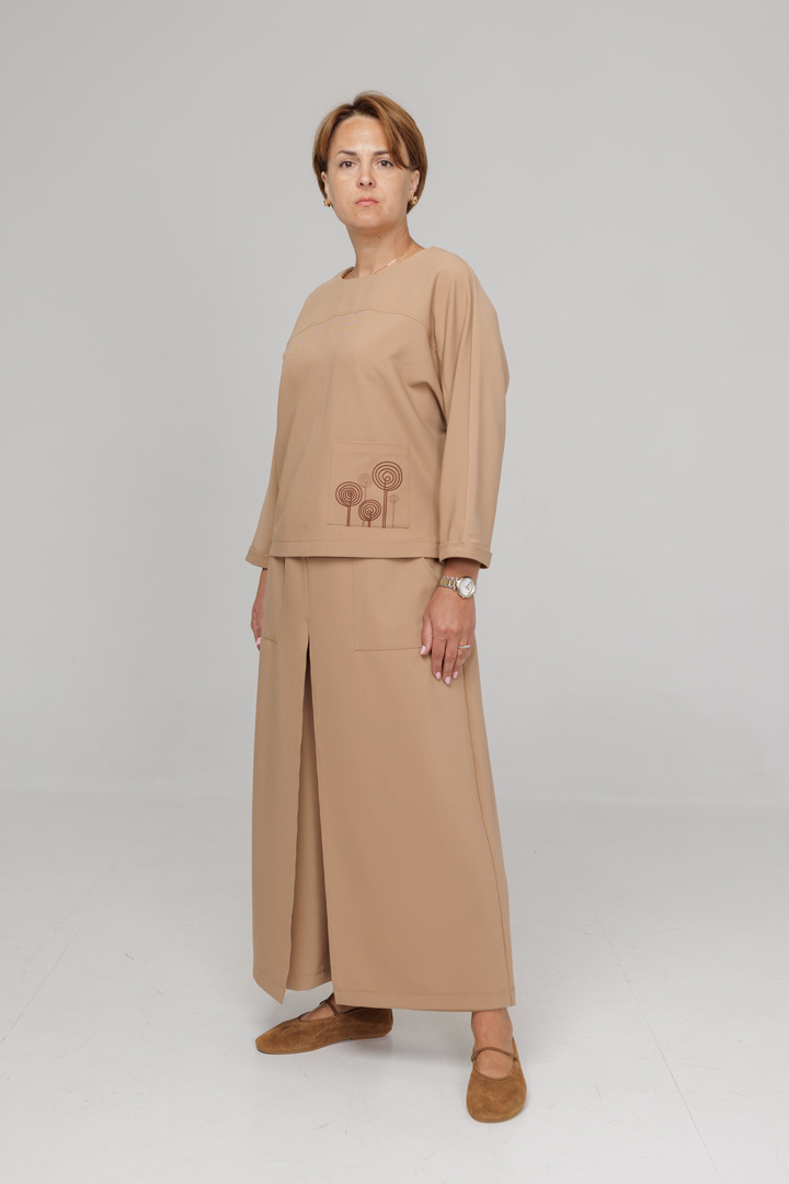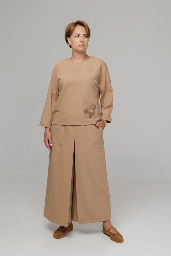 Костюм вільного силуету, який поєднує комфорт та елегантність. Акцентом виступає об'ємна квітка, яка додає образу жіночності та оригінальності. Такий костюм легко поєднувати як із класичним взуттям, так із більш повсякденними аксесуарами, створюючи образ від ділового до кежуал.
