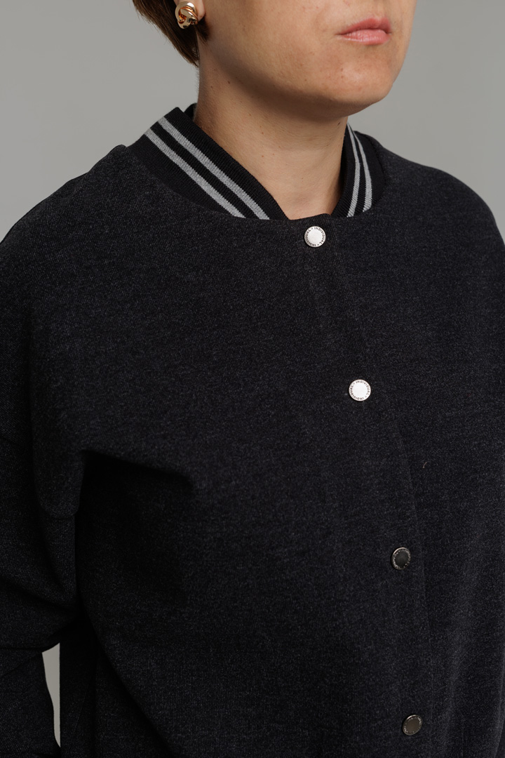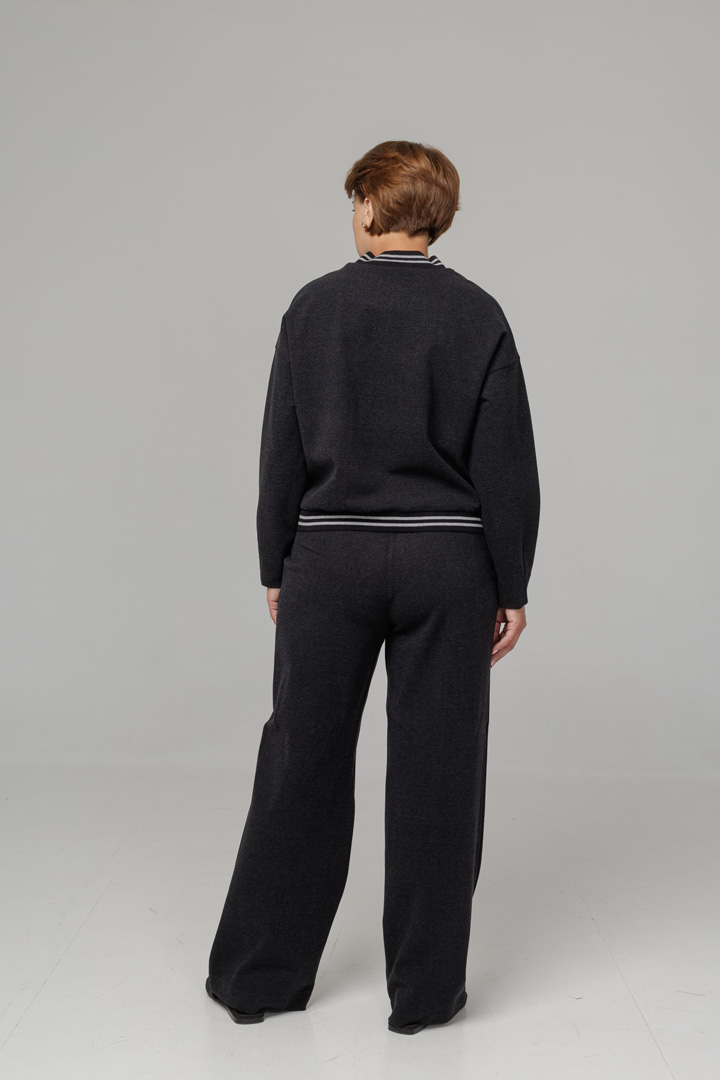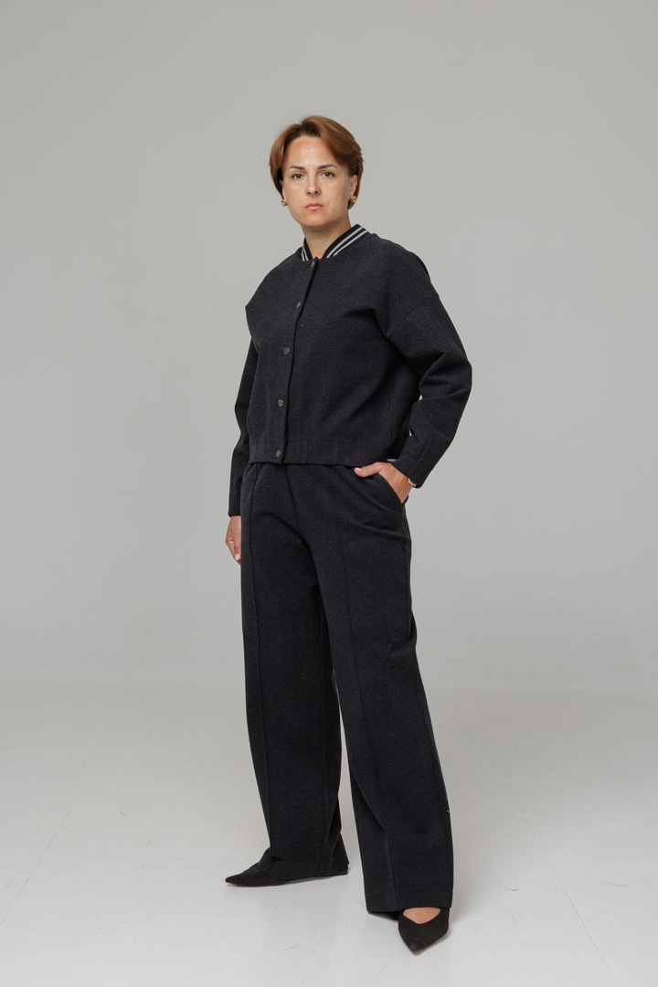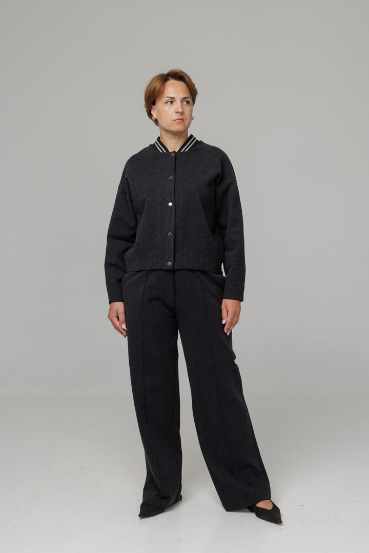 Костюм із м'якого трикотажу поєднує елегантність і комфорт. Коротка куртка-бомбер на кнопках з контрастним коміром-стійкою, який додає образу сучасності й легкої спортивної нотки. Штани - прямого крою із защипом та кишенями.