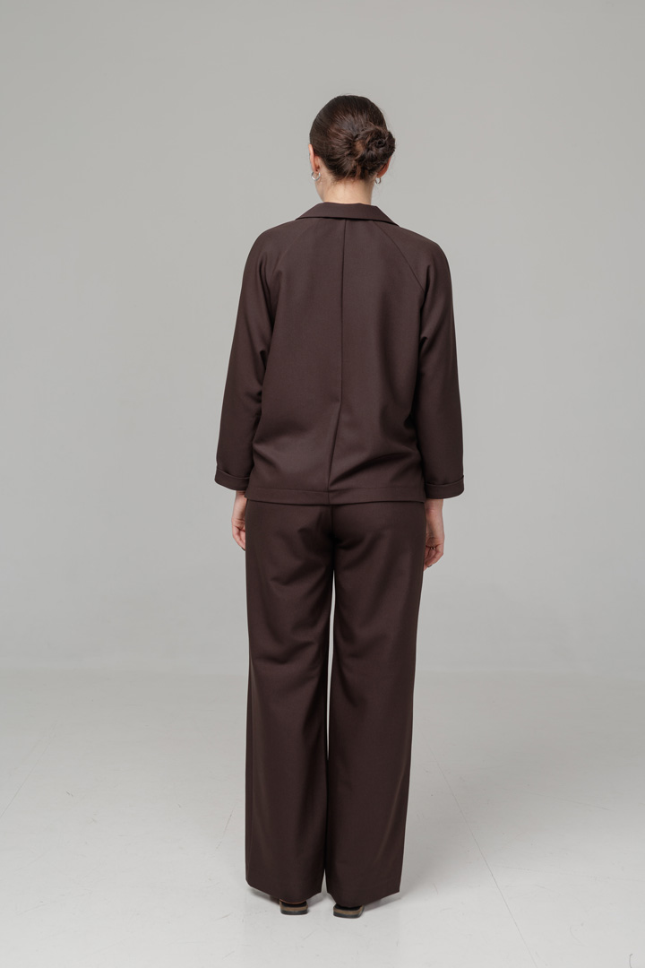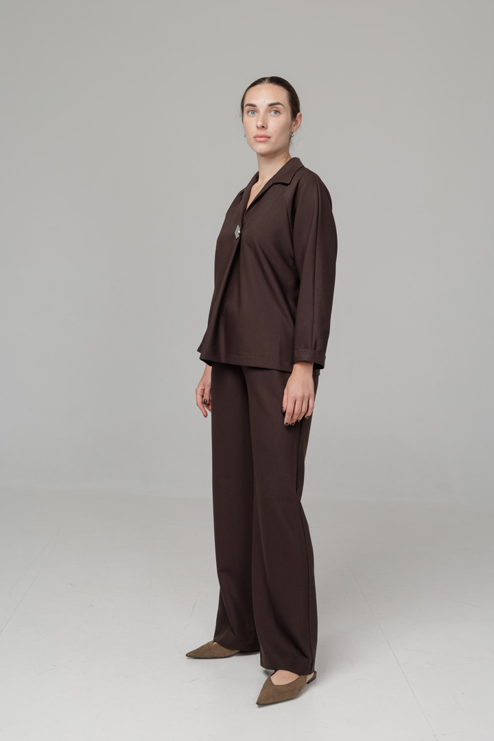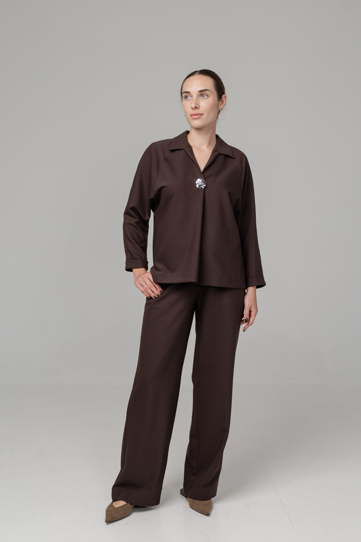 Комплект із костюмної тканини виглядає стильно і вишукано. Блуза з V-подібним вирізом та декоративним гудзиком надає образу елегантності. Штани палаццо створюють витончену силуетність та комфорт у носінні. Ідеальний вибір для поєднання класики та сучасного стилю.