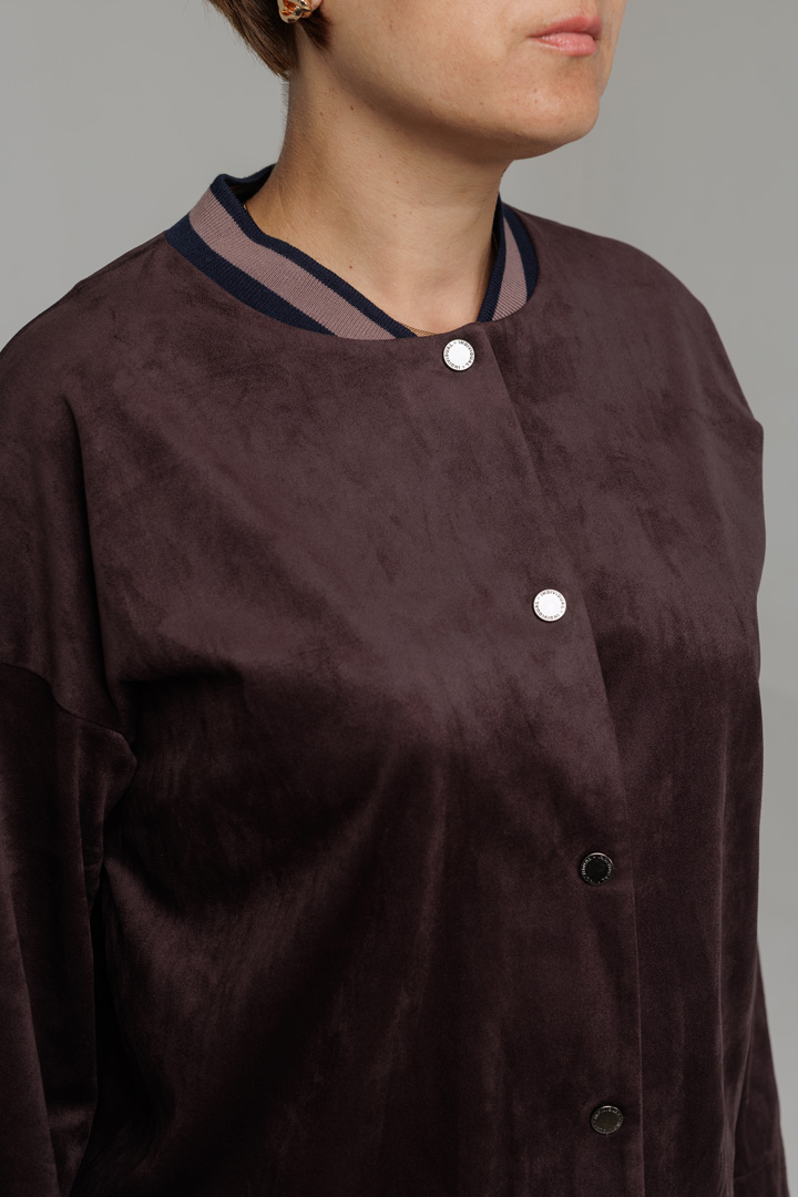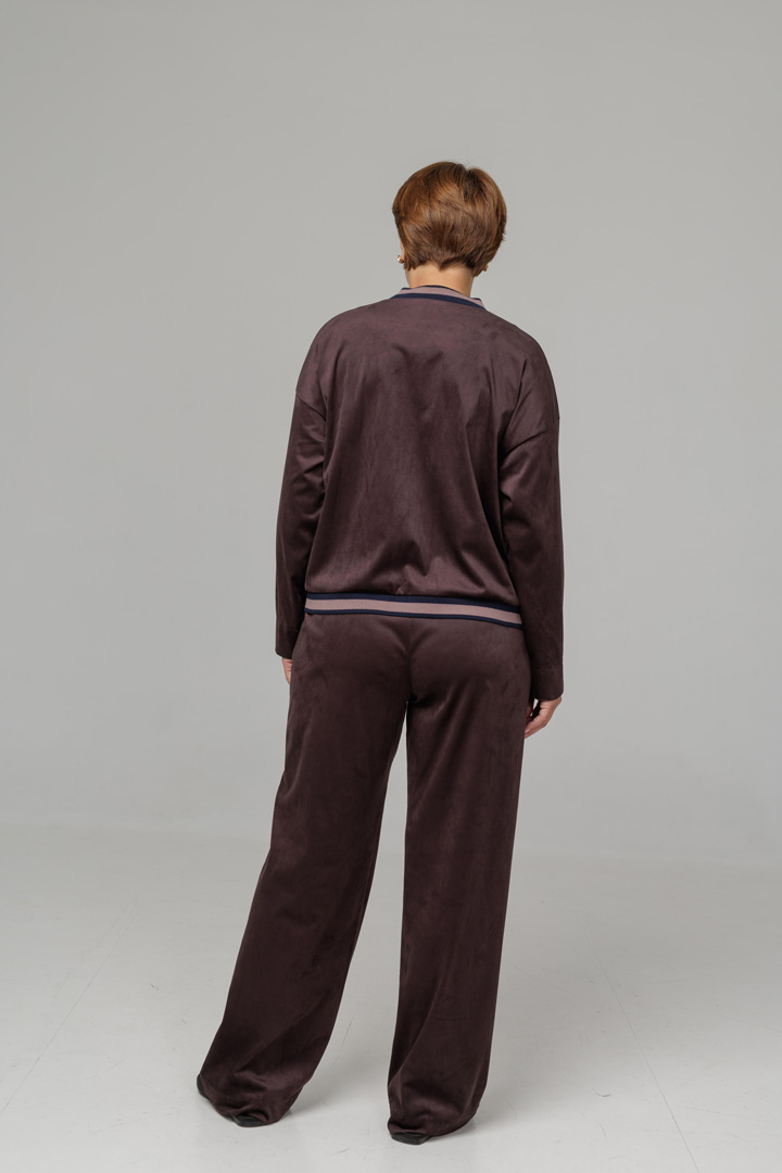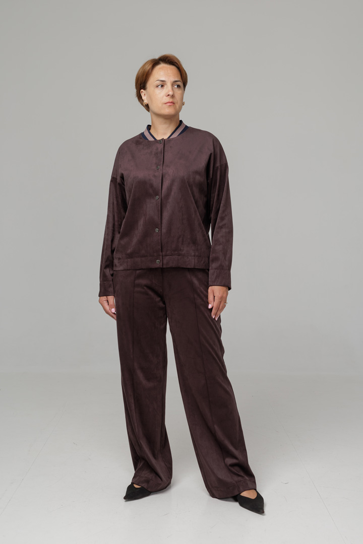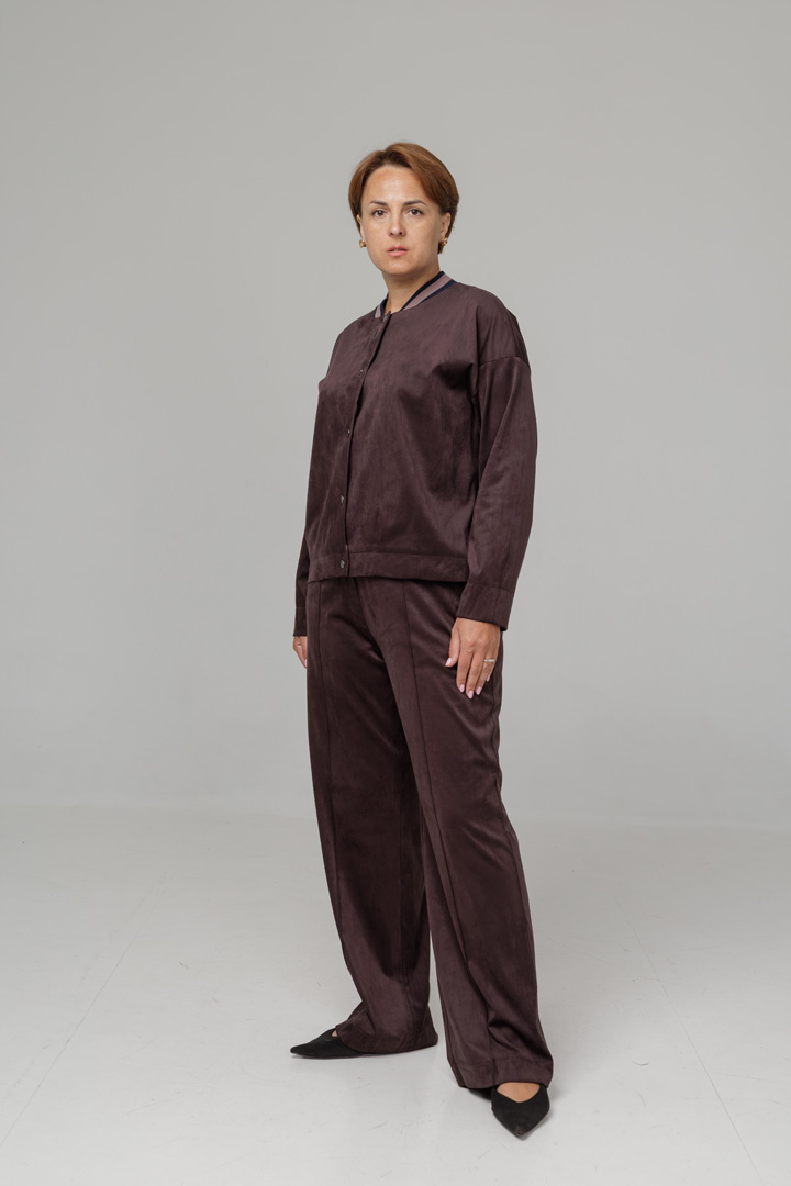Костюм із м'якої замші виглядає особливо вишукано та сучасно. Жакет доповнений дов'язом і застібкою на кнопках, що надає образу стильного акценту. Штани палаццо із защипом формують легкий та елегантний силует. Такий комплект вдало поєднує комфорт і трендовий дизайн.