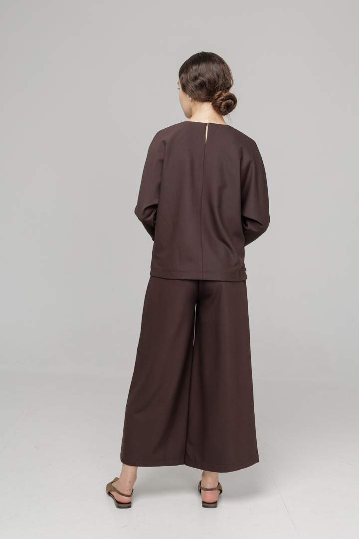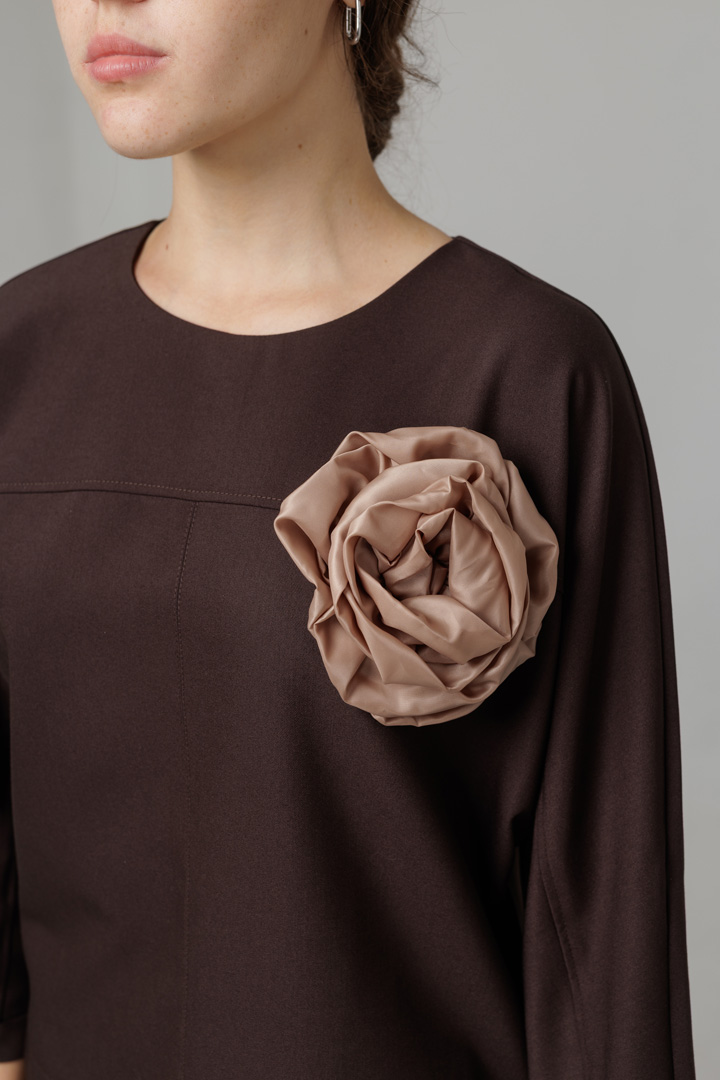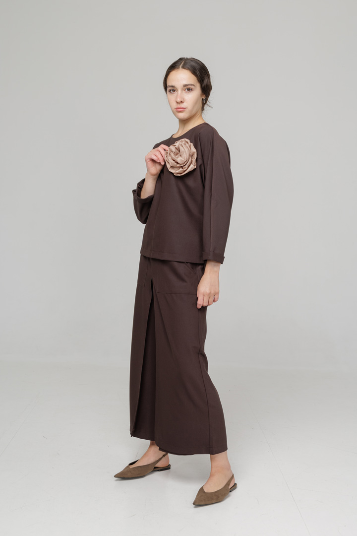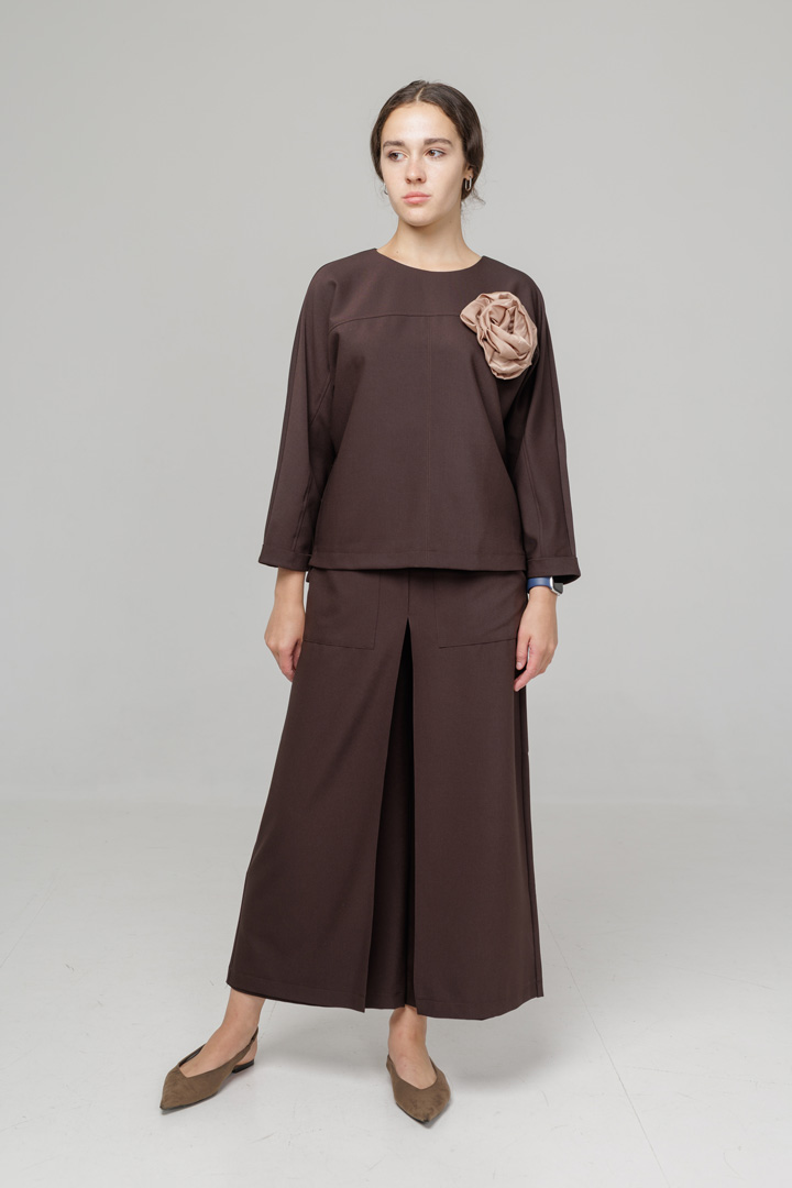 Костюм вільного силуету, який поєднує комфорт та елегантність. Акцентом виступає об'ємна квітка, яка додає образу жіночності та оригінальності. Такий костюм легко поєднувати як із класичним взуттям, так із більш повсякденними аксесуарами, створюючи образ від ділового до кежуал.