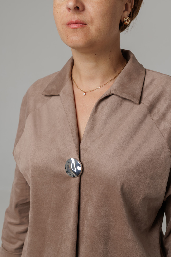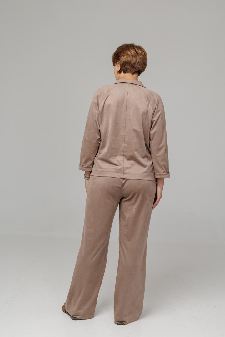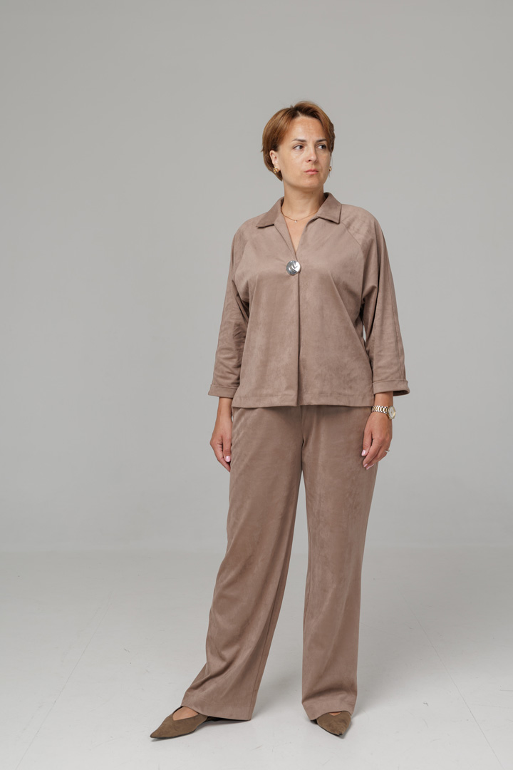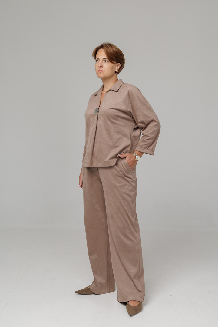 Костюм із замші виглядає стильно і вишукано. Блуза з V-подібним вирізом та декоративним гудзиком додає образу елегантності й сучасного акценту. Штани палаццо з легкою лінією крою створюють витончену силуетність та комфорт у носінні. Ідеальний вибір для поєднання класики та сучасного стилю.