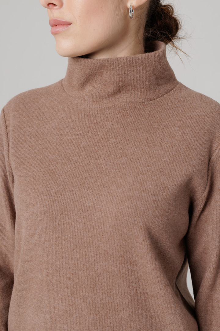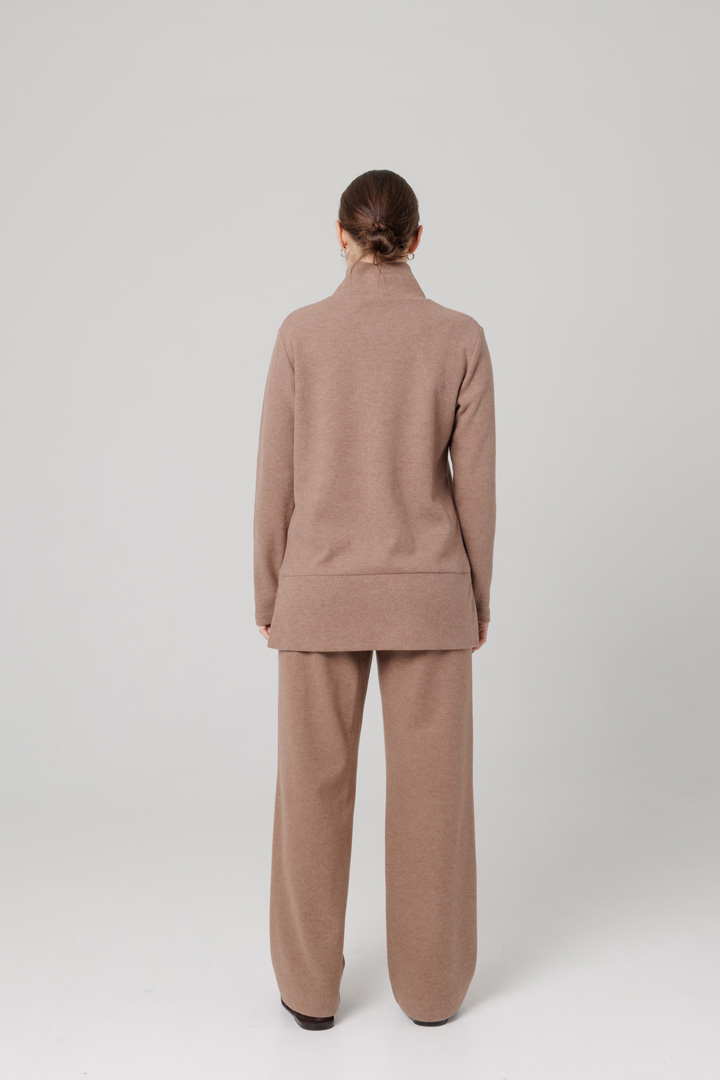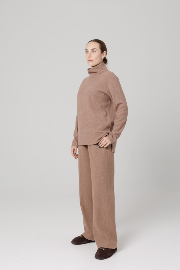 Костюм із тканини ангора - ніжний, теплий і неймовірно затишний варіант на прохолодний сезон. Светр із коміром-стійкою має вільний силует, що додає відчуття легкості, а широкі штани створюють невимушений, сучасний образ.
