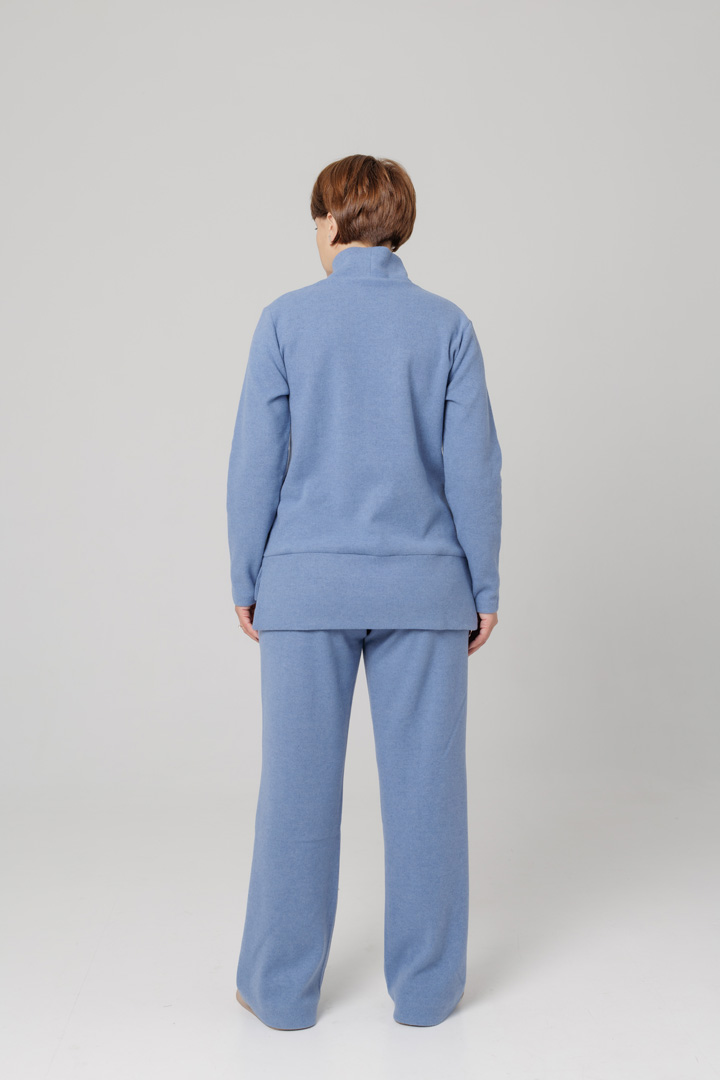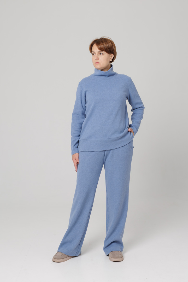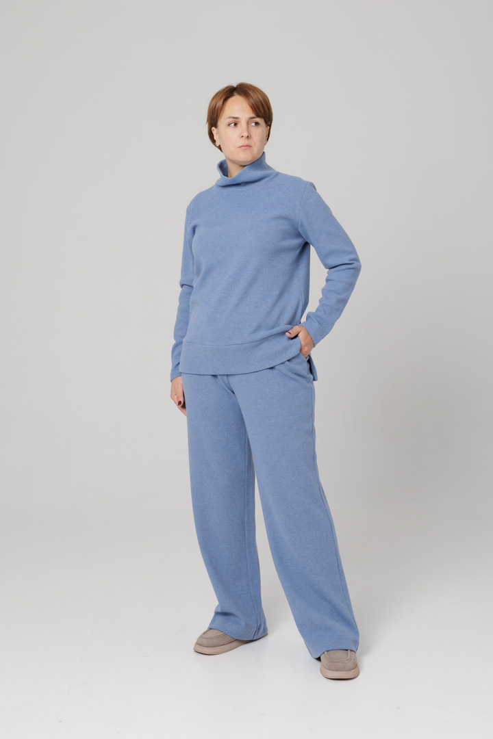 Костюм із тканини ангора - ніжний, теплий і неймовірно затишний варіант на прохолодний сезон. Светр із коміром-стійкою має вільний силует, що додає відчуття легкості, а широкі штани створюють невимушений, сучасний образ.