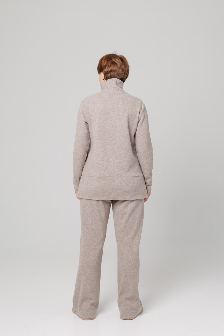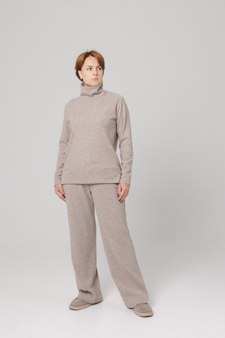 Костюм із тканини ангора - ніжний, теплий і неймовірно затишний варіант на прохолодний сезон. Светр із коміром-стійкою має вільний силует, що додає відчуття легкості, а широкі штани створюють невимушений, сучасний образ.