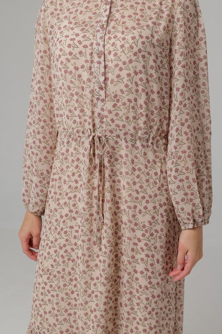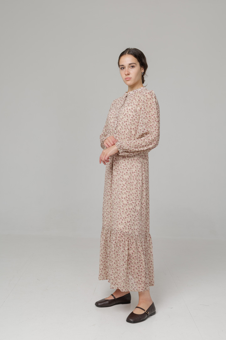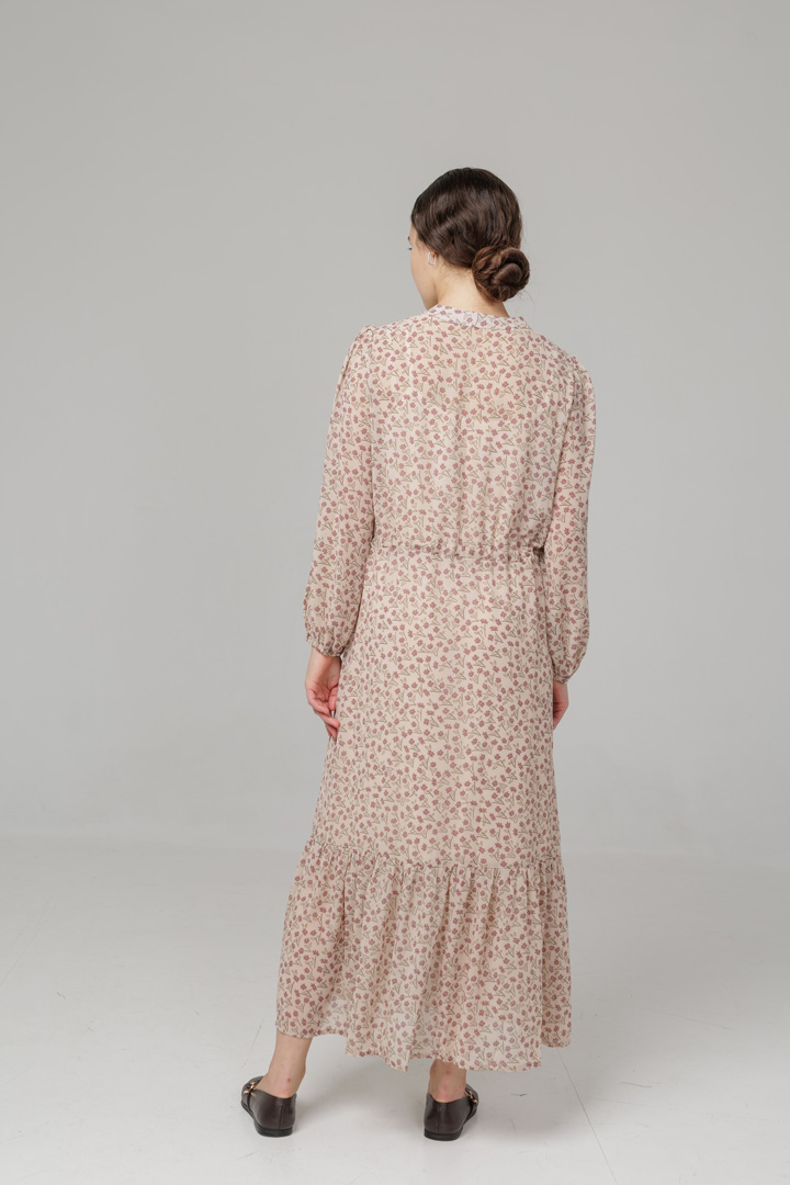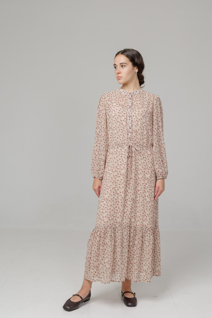Довга шифонова сукня з ніжним принтом на кулісці, що підкреслює талію та створює жіночий силует. Низ прикрашений легкою рюшею, яка додає сукні романтичності та легкості. Ідеальний варіант для святкових і повсякденних образів.