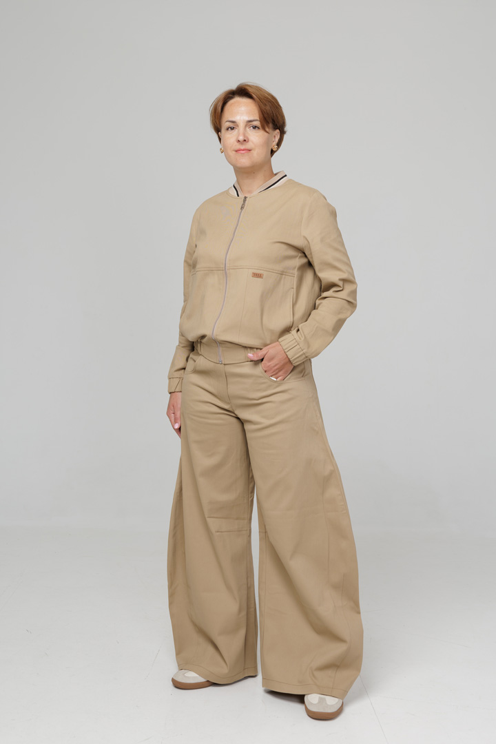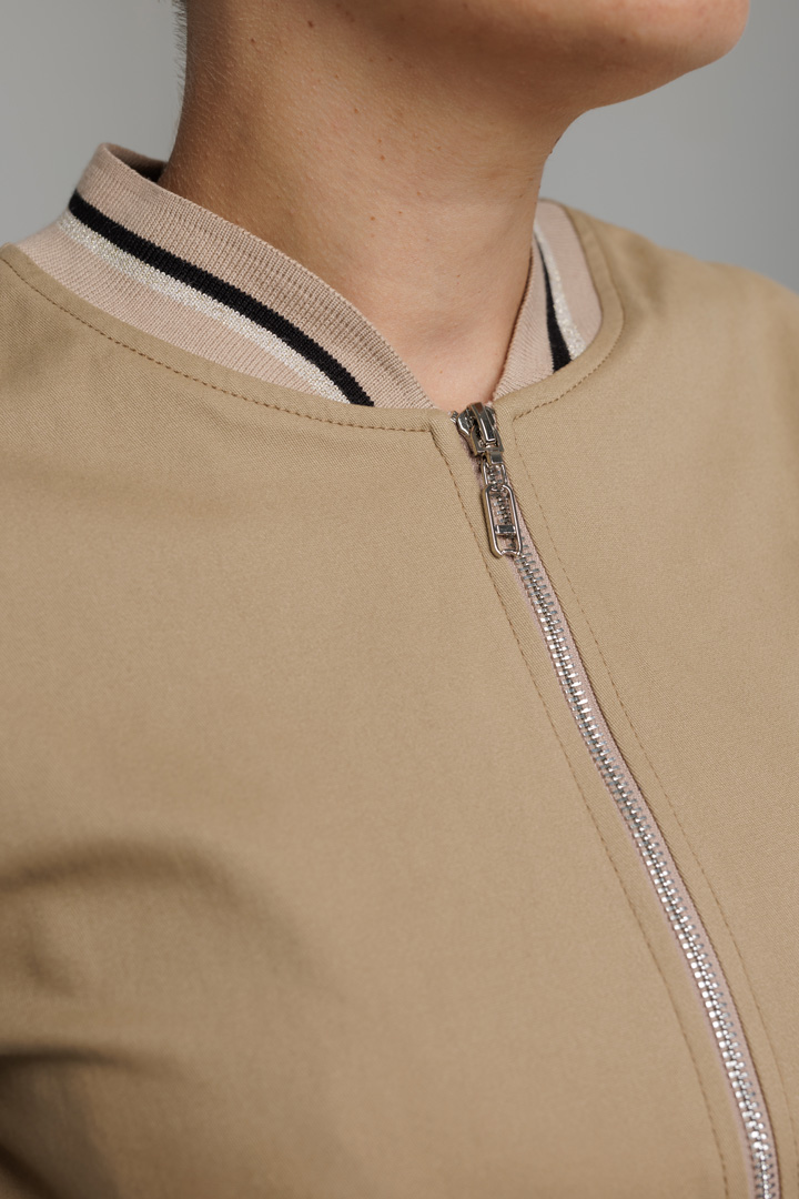 Куртка-бомбер на блискавці з комірцем-стійкою додає образу спортивної нотки.